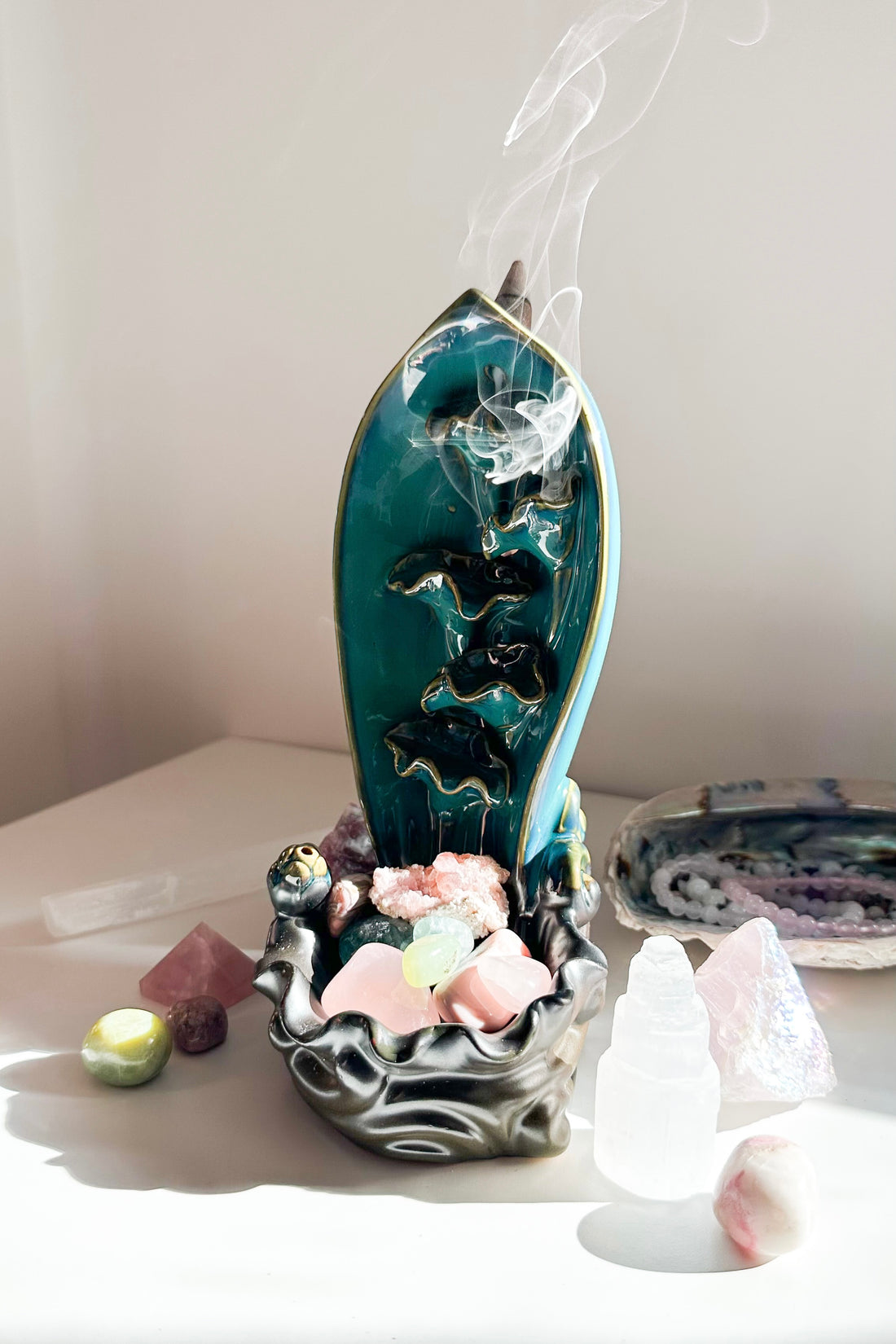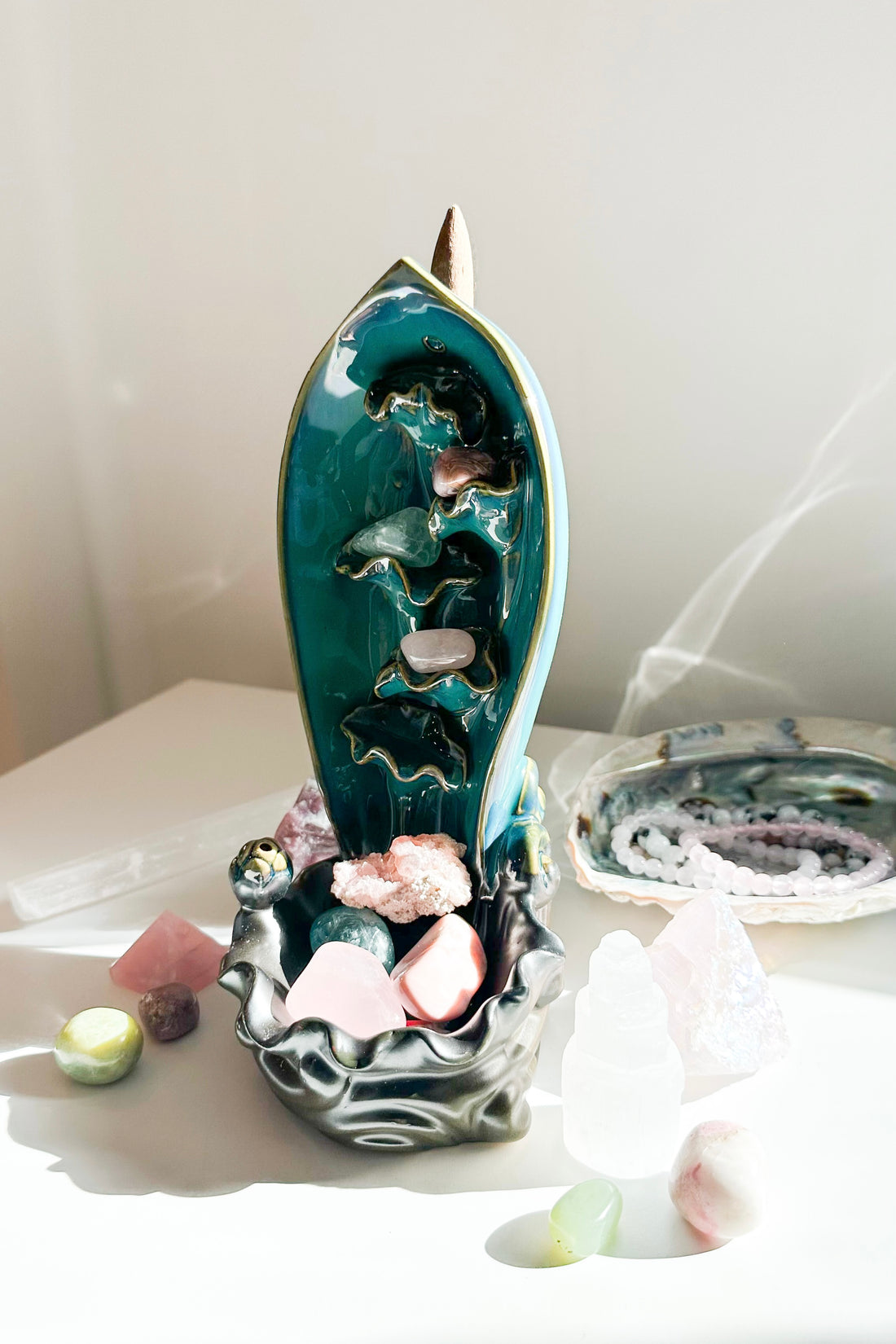 También puedes colocar tus minerales alrededor de la fuente mientras fluye el humo para limpiarlos y recargarlos energéticamente.